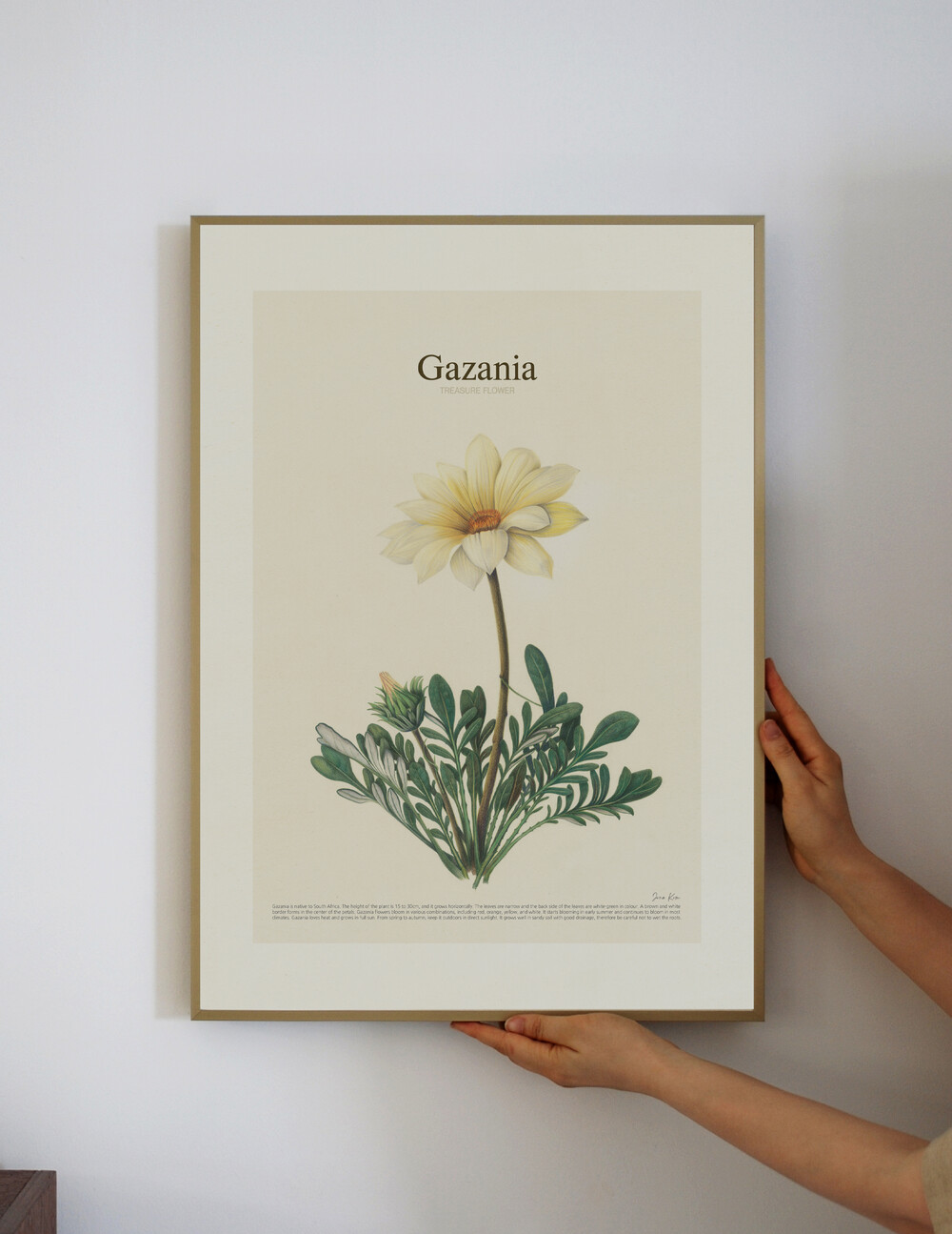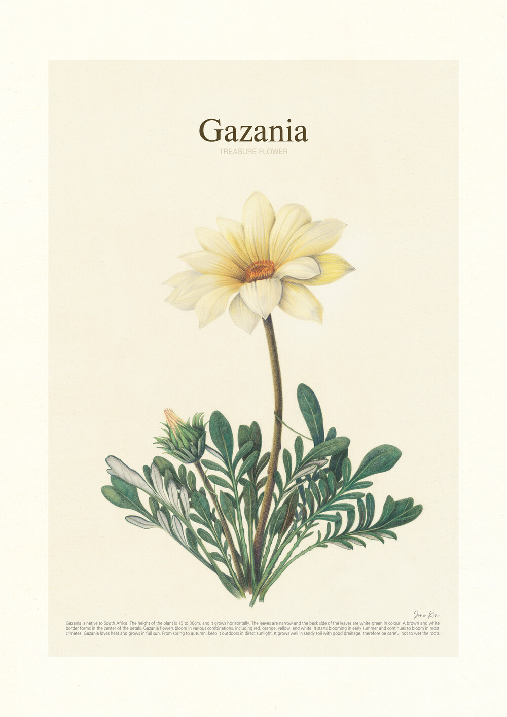 작품 속 가자니아는 은은한 연노란색의 가자니아 꽃 그리고 넓게 펼쳐놓은 듯한 가자니아 잎의 구도를 보여줍니다.