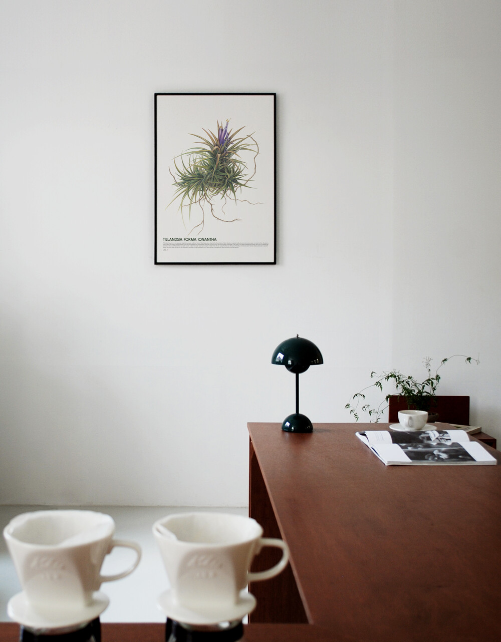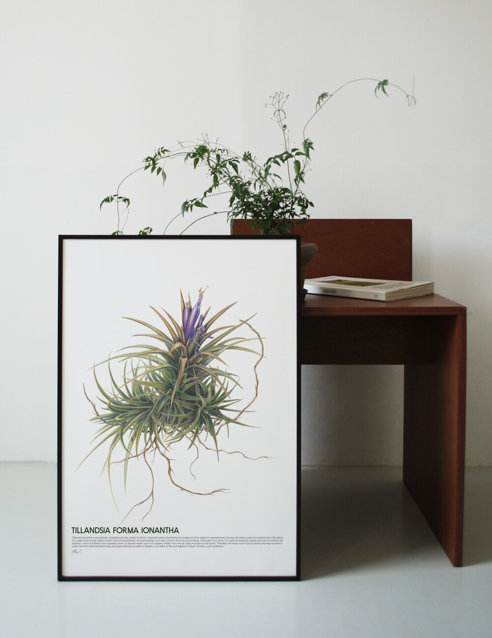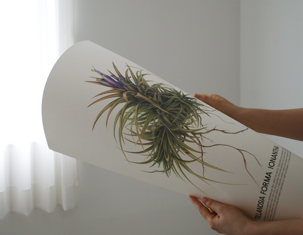 틸란드시아 이오난사는 착생식물[ : 나무나 바위와 같은 토양 이외의 것이나 다른 식물 표면에 뿌리와 기근(氣根)의 대부분을 노출하고 착생하는 식물]로 '에어 플랜트 : air plant'라고도 부릅니다. 트리콤이라는 솜털 부분으로 공기 중의 먼지를 흡착하고 양분과 수분을 섭취하여 먼지 제거와 제습, 공기 정화 효과를 볼 수 있는 식물이라고 합니다. 바라보는 것 만으로도 힐링이 될 수 있도록, 담백하게 종이 위에 식물을 담아내 보려고 표현하였습니다.