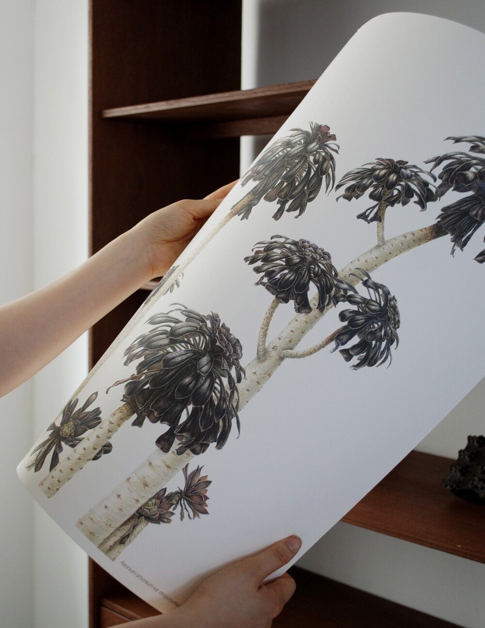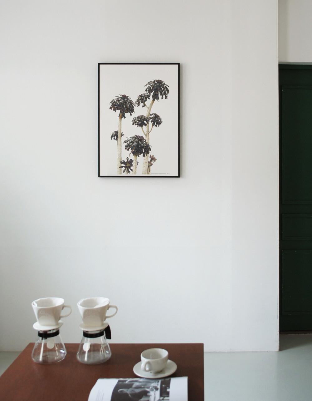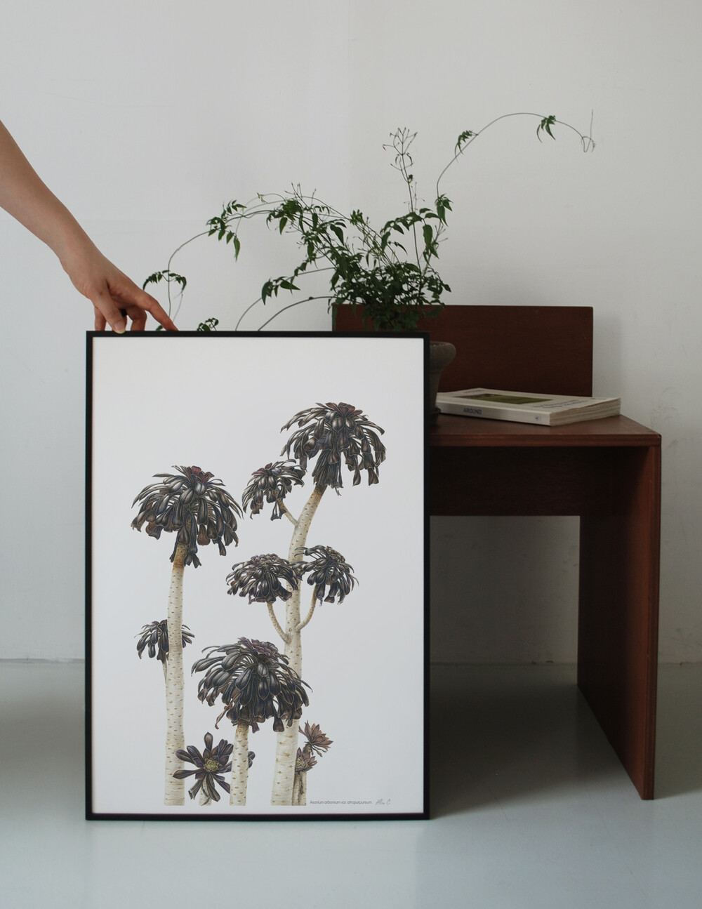 Aeonium arboreum, 흑법사는 다육식물(:사막, 높은 산과 같은 건조한 환경에서 생존하기 위해 줄기, 잎, 뿌리에 많은 양의 수분을 저장할 수 있는 식물)로 '흑법사'라는 이름에 걸맞게 거무스름한 독특한 잎의 색이 매력적이다. 잎의 모양이 꽃 같아 흑장미 같은 느낌을 주고 줄기는 나무와 같은 톤으로 존재만으로도 매력적이라 작가가 작업하면서 내내 신비로웠던 식물 중 하나이다. 블랙과 베이지 색의 조합으로 현대적으로 식물을 표현해 줄 수 있는 인테리어 포스터이다.